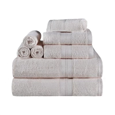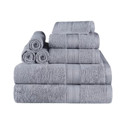 Create an elegant look in your bathroom with the Arrakis Rayon From Bamboo Cotton Blend 8 Piece Bath Towel Set by Blue Nile Mills. Crafted from a blend of bamboo and cotton for comfort and durability, these silky-soft bamboo bath towels provide a versatile absorption, perfect for the shower, bath, or beach. The pattern is a unique solid color towel with a coordinating border that will match with any Modern, Classic, Traditional, or Contemporary bathroom.