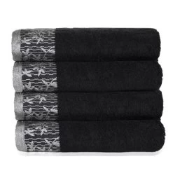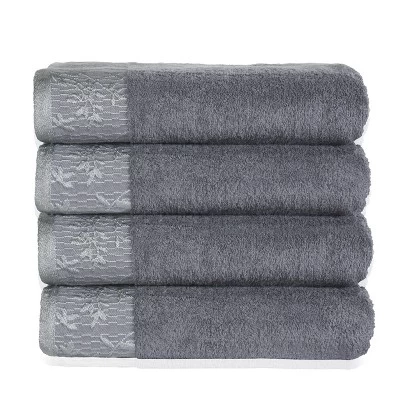 Add a perfect, elegant accent to your master or guest bath with the Calsley 4-Piece Bath Towel Set. This bundle is made from premium Cotton fibers with a cozy towel weight that gets you dry quickly. This set includes 4 oversized bath towels measuring 30” x 54”. These towels are plush, ultra-absorbent and boast hard-wearing properties that withstand countless washes that remain plush and soft when your dry off. Calsley comes in your choice of black or gray and are decorated with a woven dobby border of whimsical Wisteria flowers. Enjoy a relaxing, spa-style experience every time you step out of the bath or shower with these cozy and charming towels.