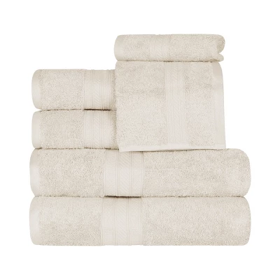 Experience the luxurious feel of the Yamparti Towel Set. These sumptuous towels provide a quick and sophisticated update to any bathroom or shower space. Crafted with quality, Long-Staple Combed Cotton, the single-ply construction makes these towels just as long-lasting and durable as they are stylish. This charming set includes 2 bath towels, 2 hand towels, and 2 face towels/washcloths in an assortment of solid colors. Featuring crisp, hemmed edges and a detailed border, this gorgeous set is sure to elevate the beauty of your bathroom and give you a look you will love.
