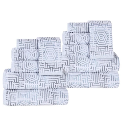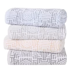 Give your master and guest bathroom the dream makeover with the Cotton Modern Geometric Jacquard 550 GSM 12 Piece Bathroom Towel Set by Blue Nile Mills. Our medium weight cotton towels provide comfort, durability, and versatile absorption, perfect for the shower, bath, or beach. These plush and fluffy towels will sop up moisture effortlessly, keeping you warm and dry. Featuring a geometric jacquard design, these elegant towels are available in gold, blue, platinum, and charcoal color options to seamlessly match your bathroom style. This bathroom towel set includes; 4 face towels, 4 hand towels, and 4 bath towels.