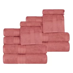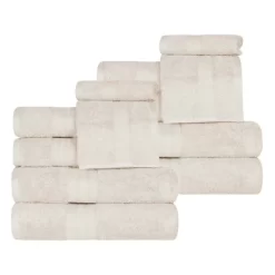 Refresh your daily bathroom accessories for the whole family with the Cotton Heavyweight 12 Piece Towel Set Set by Blue Nile Mills. Crafted from cotton with a plush terry loop weave, these ultra-soft towels are the perfect addition to your everyday bathing routine. Our most luxurious cotton towels have an incredibly soft feel against your skin and a heavy towel weight to help get you dry quickly. Featuring a classic and elegant solid design with a decorative dobby border, these towels have a 2-ply thickness for maximum absorbency. Perfect for bath time and during your daily routines, this set of bath, hand and face towels is versatile and convenient. These durable towels come in a variety of solid colors, including; almond cream, allure blue, blush pink, hot chocolate brown, green essence, grape shake purple, grey, ivory, rivulet teal, sandstone brown, and white to give any home a touch of luxury hotel style.