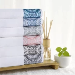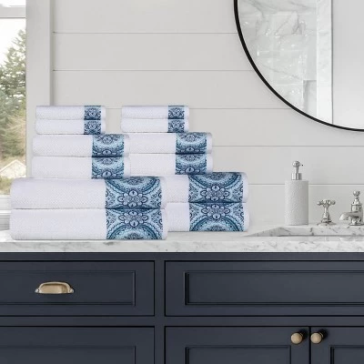 Bring a touch of luxury comfort to your bathroom with the Medallion Cotton Jacquard 3 Piece Assorted Towel Set by Blue Nile Mills. Crafted from premium cotton, each bath towel, hand towel, and face towel feels ultra-soft on your skin. Each towel in this set has a medium towel weight for maximum absorbency and comfort. Featuring a textured white color with a contrasting medallion border, this towel set is soft, fluffy, and quick-drying.