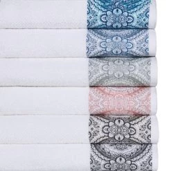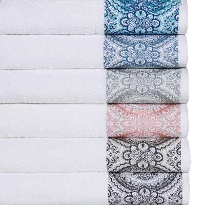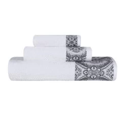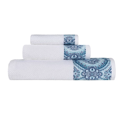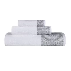 The elegant Aaliya Medallion Turkish Cotton Highly Absorbent 3 Piece Jacquard Towel Set by Blue Nile Mills combines cozy modern style with a dash of traditional appeal. Crafted from a premium Cotton construction, this coordinated 3 piece set includes; one bath, one hand, and one face towel/ washcloth to create a seamless traditional look. For comfort and durability, each towel is highly absorbent, perfect for the shower, bath, or beach. The pattern is a unique textured white with a colored medallion border design that will match with any modern, traditional, or classic space.