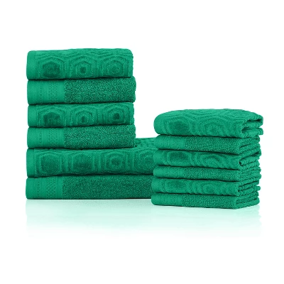The Swanfield 12-Piece Honeycomb Jacquard and Solid Towel Set features 2 bath towels (1 jacquard and 1 solid), 4 hand towels (2 jacquard and 2 solid), and 6 face towels/washcloths (3 jacquard and 3 solid). The double terry loop construction and medium towel weight provides hotel-like softness and ultimate absorbency. This machine washable towel set is available in 10 alluring color options and is the perfect addition to your bathroom decor. Elevate the beauty of your master or guest bathroom with this stylish and absorbent towel set.
