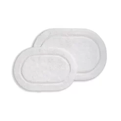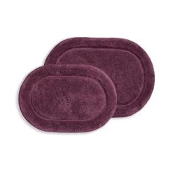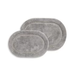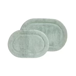 Add style and comfort to your bathroom with the Bassett Non-Slip Oval Bath Rug Set. This pair is crafted from premium Cotton fibers with a latex spray backing that keeps it in place and are durable, soft and absorbent underfoot. Each set comes with 1 large oval rug measuring 24” x 36” and 1 small oval rug measuring 20” x 30”. These rugs can be placed together in 1 room or spaced between a master and guest bath for a continued, uniform look. Available in multiple solid colors with a simple etched border trim for added texture, these rugs bring cozy color to your bath or shower routine.