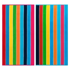 Be bold and bright this season with the energetic style of the Rainbow Striped Cotton Oversized Reversible Beach Towel Set by Blue Nile Mills. Crafted from Cotton, these beach towels feature a cheerful rainbow stripe design. Each towel is softer and more durable than standard cotton beach towels with plush velour that repels water and sand. Displaying an inverted design, these towels create a perfectly coordinated look. Perfect for adults and kids alike, these beautiful towels are colorfast and machine washable. This beach towel set is the perfect summer essential for drying off and lounging in the sun.