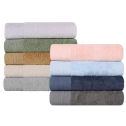 Coordinate the look of every bathroom in your home with the stylish Rayon From Bamboo Cotton Blend 12 Piece Bathroom Towel Set by Blue Nile Mills. Our fluffy bamboo cotton blend towels have a luxuriously soft feel and are naturally hypoallergenic, ideal for people with allergies or sensitive skin. Featuring an eco-friendly design that stays fresher longer and resists shrinking, wrap yourself in the extra clean feeling of these absorbent towels. For comfort and durability, the medium weight thickness of each towel is perfect for the bath, poolside, or at the beach. Displaying a beautifully textured border, these towels are available in pink, navy blue, charcoal, light blue, white, ivory, green, platinum grey, and yellow gold color options to match your bathroom decor style. This assorted bathroom towel set includes; 4 face towels, 4 hand towels, and 4 bath towels.